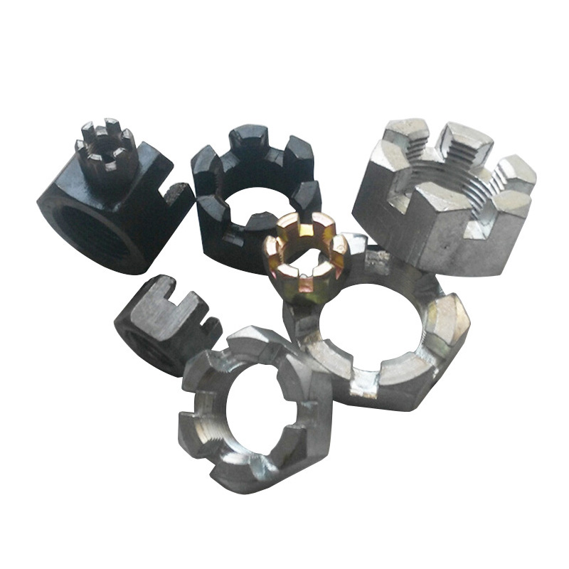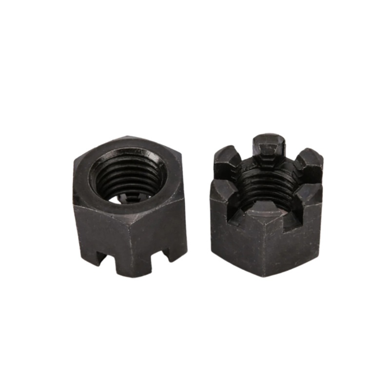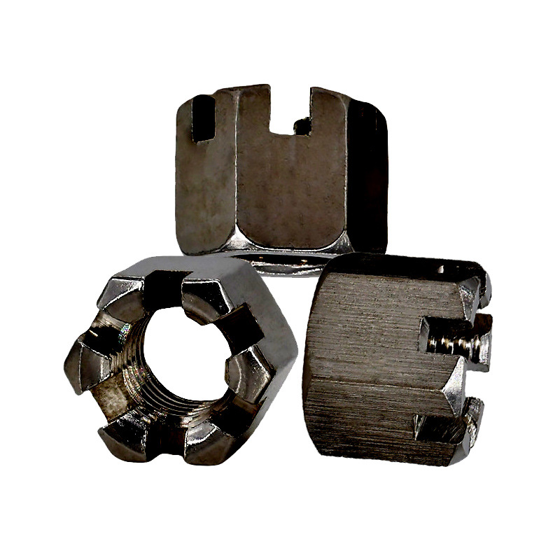 Прецизно-машинско круна навртка со слот обично се прават од силен јаглероден челик или легура челик-како одделение 5, одделение 8 или AISI 4140. Овој имот им дава одлична цврстина, а тие исто така добро функционираат во трите клучни механички својства на јачината на затегнување, јачината на приносот и јачината на смолкнување. Да се биде направен од силен челик значи дека овие ореви можат да управуваат со многу сила на стегање и стрес од употреба без да се наведнуваат или кршат. Затоа тие работат добро за работни места со тешки места на тешки места-како структурни рамки, погони и делови за суспензија.